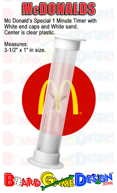 Special 1 Minute Timer for McDonalds Corporation and Franchisees. Clear plastic with White end cap and white sand. Measures 3-1/2" x 1" in size. NOTE: Sand timer time may vary slightly. Custom sand timers available, contact us for details. |